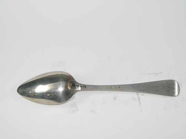 Tafellepel uit de negentiende eeuw, steel met middenribbe en omhoog gebogen ronde kop, aan de achterzijde dubbel Amsterdams lof, ovale lepelbak. Op onderzijde steel is een monogram gegraveerd met de initialen: D.I.A./ O.V.H./, de afkorting van Diaconie Oude Vrouwenhuis, alsmede de namen van de diakenen en diaconessen en het jaar van hun aantreden in die functie.