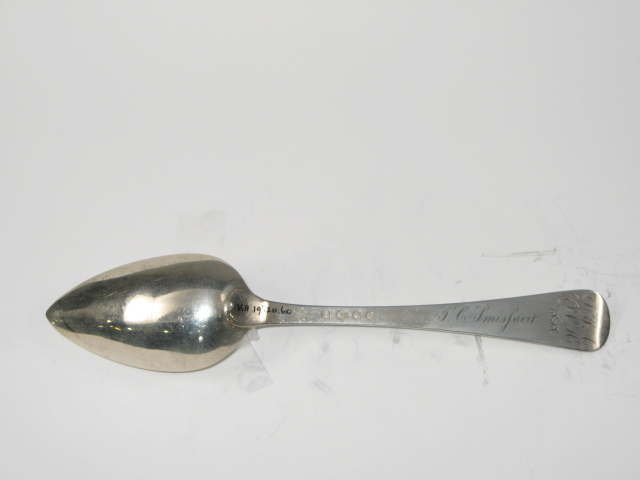 Tafellepel uit de negentiende eeuw, steel met middenribbe en omhoog gebogen ronde kop, aan de achterzijde dubbel Amsterdams lof, ovale lepelbak. Op onderzijde steel is een monogram gegraveerd met de initialen: D.I.A./ O.V.H./, de afkorting van Diaconie Oude Vrouwenhuis, alsmede de namen van de diakenen en diaconessen en het jaar van hun aantreden in die functie.