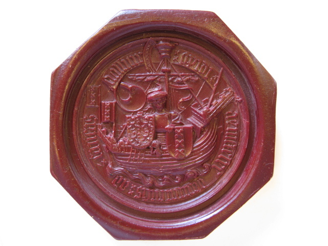 Dit zilveren zegel werd gebruikt voor belangrijke stukken. Het handvat heeft de vorm van een leeuw. De afdruk vertoont het koggeschip.