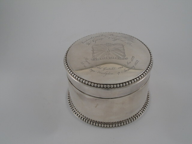 Ronde zilveren doos met deksel. Op deksel een cartouche met wapen van Burgerweeshuis (duif, Amsterdamse andreaskruisen) en tekst boven en onder cartouche.