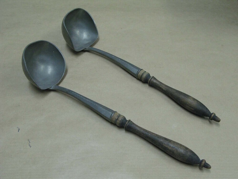 Twee tinnen lepels met houten heft.- Trefwoorden
