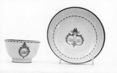 rond kopje zonder oor met diep schoteltje. Décor van médaillons aan paars lint met vergulde monogrammen ADB en HFAC- HerkomstTheeservies voor 350 gulden op 29 mei 1889 door S.A. Lopez Suasso-De Bruijn aangekocht; legaat van mevrouw S.A. Lopez Suasso-de Bruijn, Amsterdam, 1890.