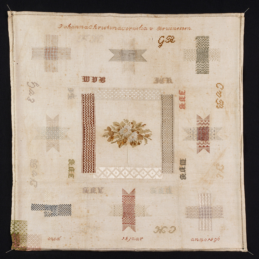 opschrift bovenzijde doek, tegen rand: JohannaChristinaCornelia / v / Bruinessen: naam van borduurster