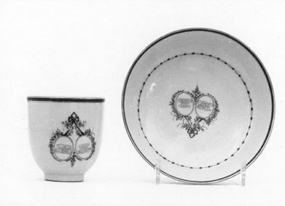 rond hoog kopje met oor en diep schoteltje. Décor van médaillons aan paars lint met vergulde monogrammen ADB en HFAC- HerkomstTheeservies voor 350 gulden op 29 mei 1889 door S.A. Lopez Suasso-De Bruijn aangekocht; legaat van mevrouw S.A. Lopez Suasso-de Bruijn, Amsterdam, 1890.