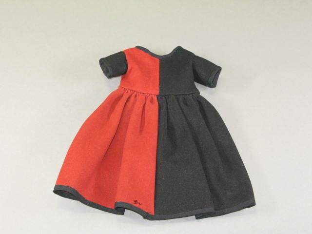 Jurk waarvan rechter deel rood en linker deel zwart. Aangezette zwarte mouwen. Hals, mouwen en onderkant rok afgezet met een zwart biesje. Achter een split met vijf haken en ogen. Lijfje met aangerimpelde rok.- Trefwoorden