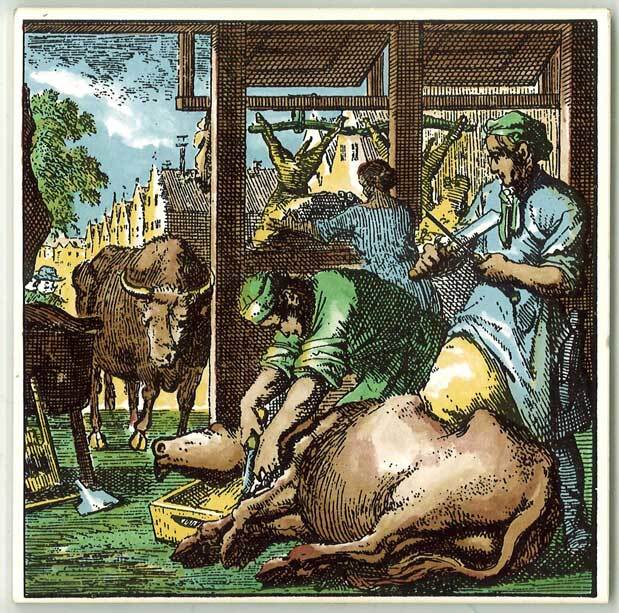 Tegel met ingekleurde reproductie van Luyken-prent 'De vleeshouwer'.- Trefwoorden