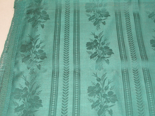 Groen damast geweven gordijn. Patroon: zes banen met bloemmotieven afgewisseld door 5 verticale banen met een geometrisch patroon.- Trefwoorden