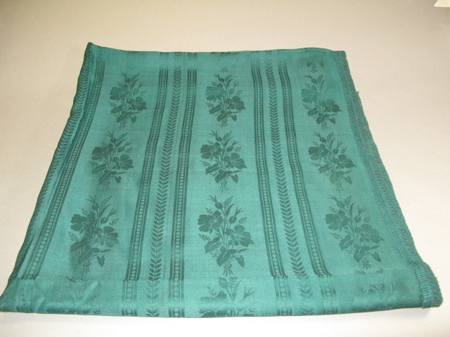 Groen damast geweven gordijn. Patroon: banen met bloemmotieven afgewisseld door verticale banen met een geometrisch patroon.- Trefwoorden