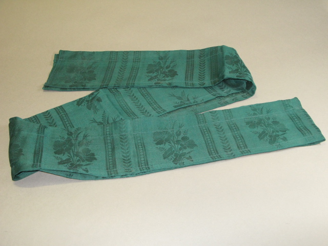 Groen damast geweven gordijn, met een brede en een smalle zoom. Patroon: banen met bloemmotieven afgewisseld door verticale banen met een geometrisch patroon.- Trefwoorden