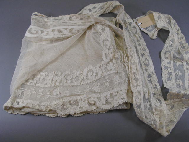 Vitrage van katoen tule met tamboereerwerk en applicatie langs de linker en rechter zijkant en de onderrand.- Trefwoorden
