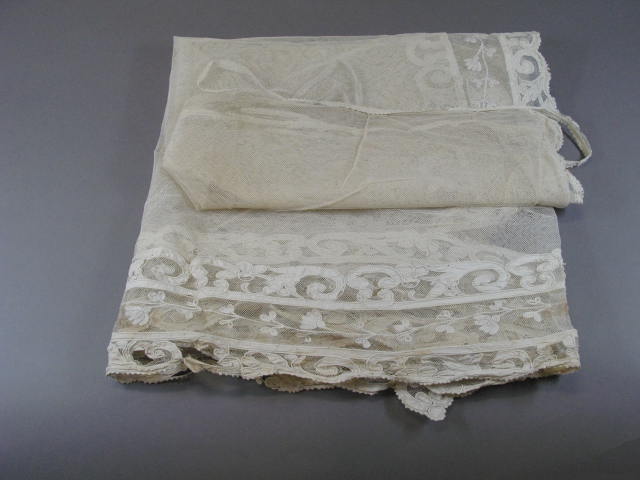 Vitrage van katoen tule met tamboereerwerk en applicatie langs een zijkant en de onderrand. Met 1 koperen ring.- Trefwoorden