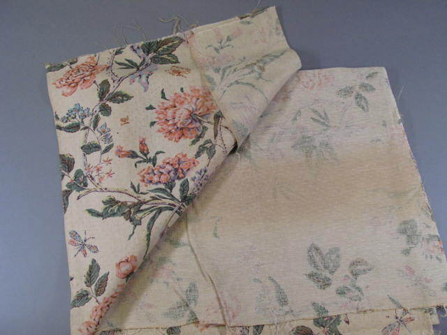 Fragment van de bekleding van de meubels uit de tuinkamer van Willet-Holthuizen. Ecru kleurig katoen damast bedrukt met bloemmotief in de kleuren roze, oranje, aubergine, groen, bruin en zacht blauw. Van het fragment is een deel afgeknipt.- Trefwoorden