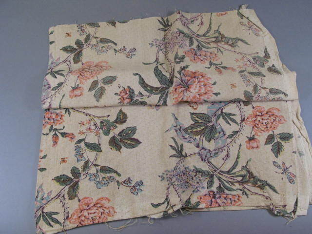 Fragment van de bekleding van de meubels uit de tuinkamer van Willet-Holthuizen. Ecru kleurig katoen damast bedrukt met bloemmotief in de kleuren roze, oranje, aubergine, groen, bruin en zacht blauw. Van het fragment is een deel afgeknipt.- Trefwoorden