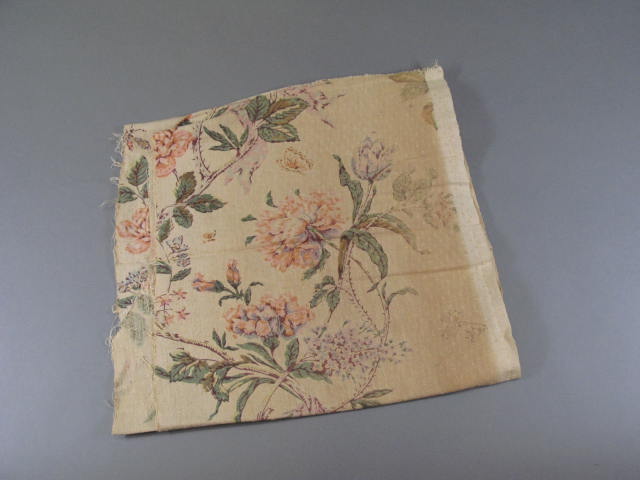 Fragment van de bekleding van de meubels uit de tuinkamer van Willet-Holthuizen. Ecru kleurig katoen damast bedrukt met bloemmotief in de kleuren roze, oranje, aubergine, groen, bruin en zacht blauw. Van het fragment zijn delen afgeknipt, een hoek ontbreekt.- Trefwoorden