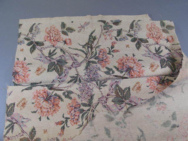Fragment van de bekleding van de meubels uit de tuinkamer van Willet-Holthuizen. Ecru kleurig katoen damast bedrukt met bloemmotief in de kleuren roze, oranje, aubergine, groen, bruin en zacht blauw. Van het fragment is een deel afgeknipt, ook zijn er stukken uitgeknipt.- Trefwoorden