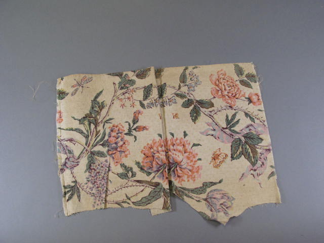 Fragment van de bekleding van de meubels uit de tuinkamer van Willet-Holthuizen. Ecru kleurig katoen damast bedrukt met bloemmotief in de kleuren roze, oranje, aubergine, groen, bruin en zacht blauw. Van het fragment is een deel afgeknipt, ook is er een stuk uitgeknipt.- Trefwoorden