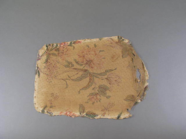 Fragment van de bekleding van een stoel uit de tuinkamer van Willet-Holthuizen. Ecru kleurig katoen damast bedrukt met bloemmotief in de kleuren roze, oranje, aubergine, groen, bruin en zacht blauw. In de randen van het fragment zitten kleine spijkergaatjes.- Trefwoorden
