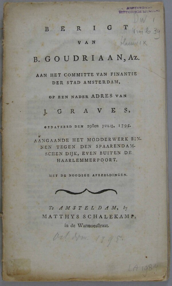 - Berigt van B.Goudriaan aan het Committe van Finantie der Stad Amsterdam, op een nader Adres van J.Graves, aangaande het modderwerk binnen tegen den Spaarendamschen Dijk, even buiten de Haarlemmerpoort. Amsterdam, Matthys Schalekamp, [1795]