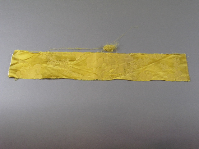 Fragment van goud-geel zijden damast met ingeweven bloemmotief. Tussenvoering van zware kwaliteit molton. Achtervoering van mosterdkleurige voeringkatoen in satijnbinding.- Trefwoorden