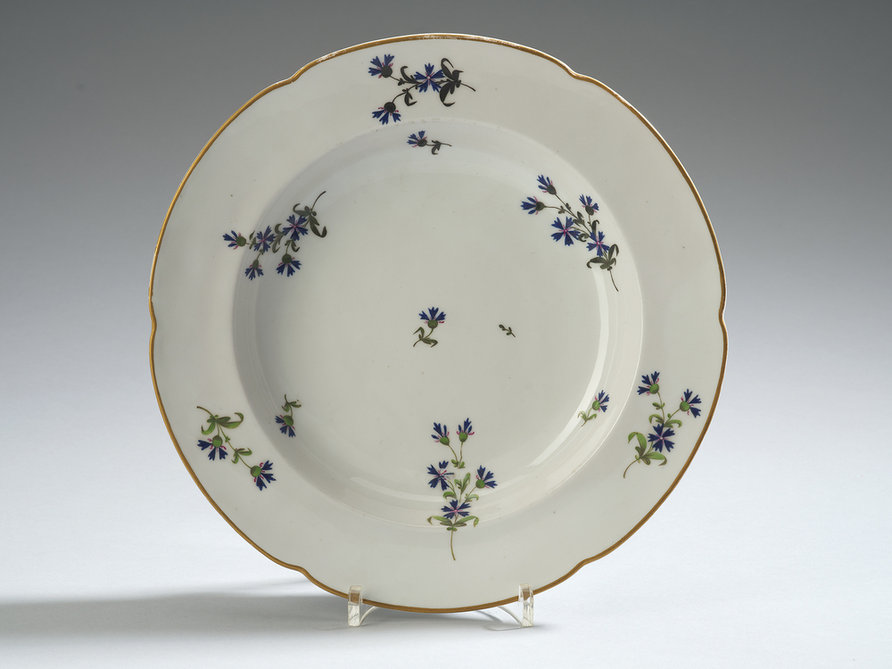 Diep, gecontourneerd bord beschilderd met korenbloemen. Merk: M.o.L. en ster- Trefwoorden