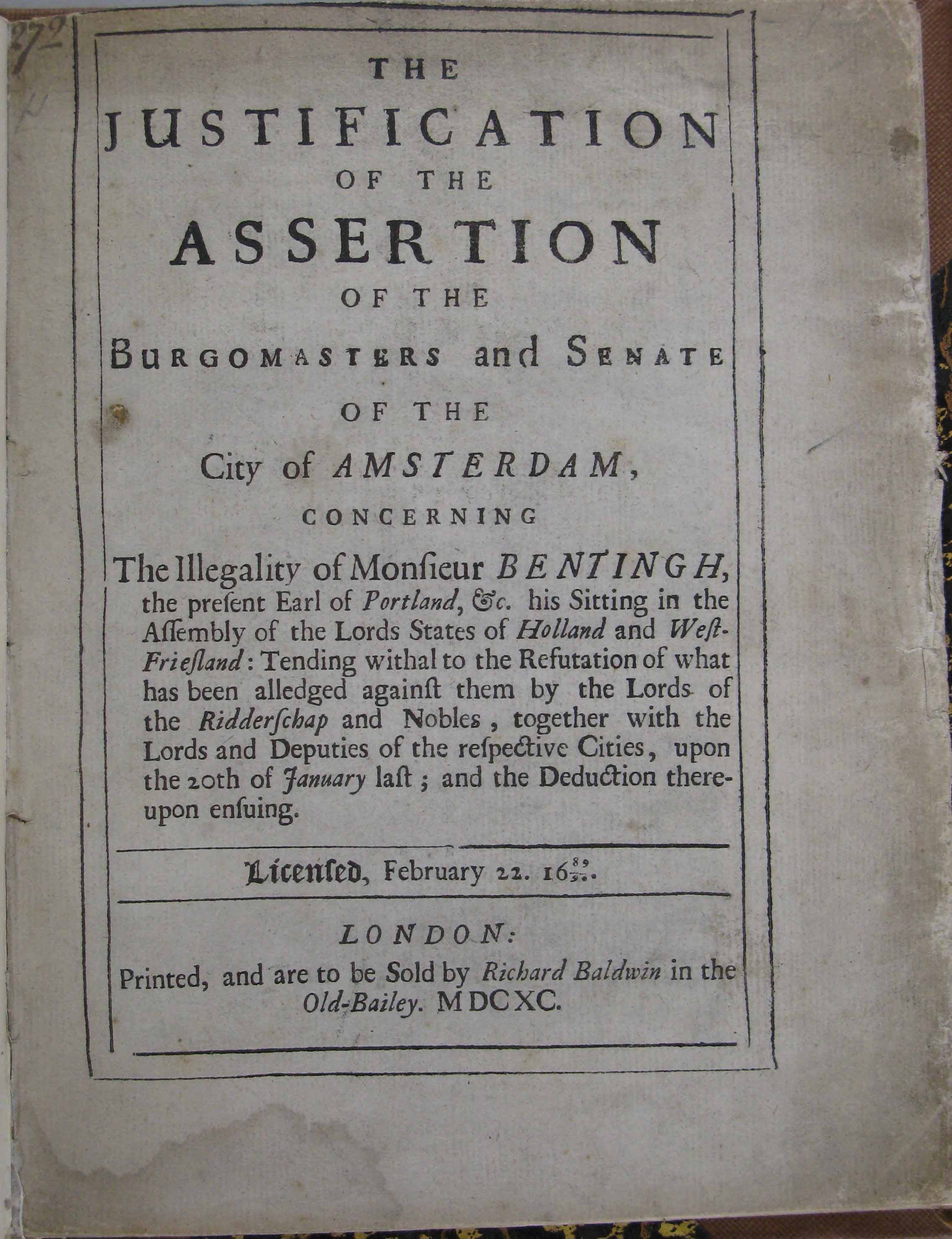 - Justification of the Assertion of the Burgomasters and Senate of the City of Amsterdam, concerning The Illegality of Monsieur Bentingh, the present Earl of Portland, etc.