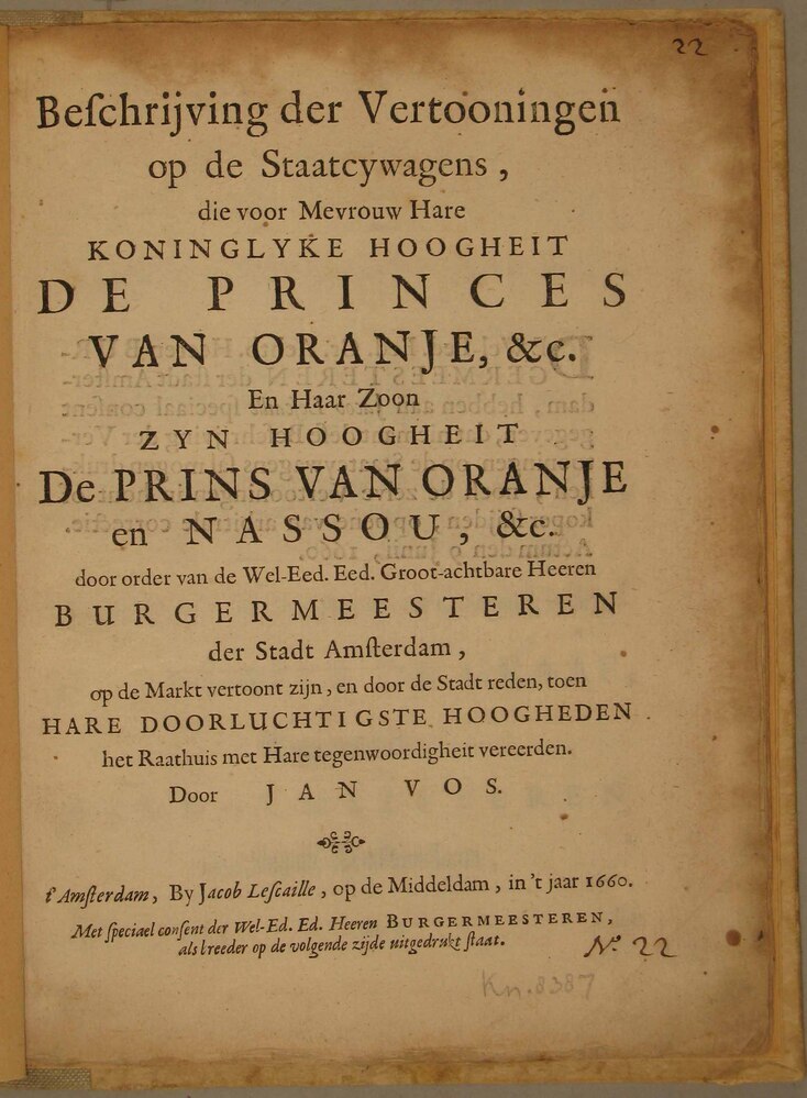 - Beschrijving der Vertooningen op de Staatcy-wagens, die voor... De Princes van Oranje, etc en Haar Zoon... De Prins van Oranje en Nassou... op de Markt vertoont zijn...