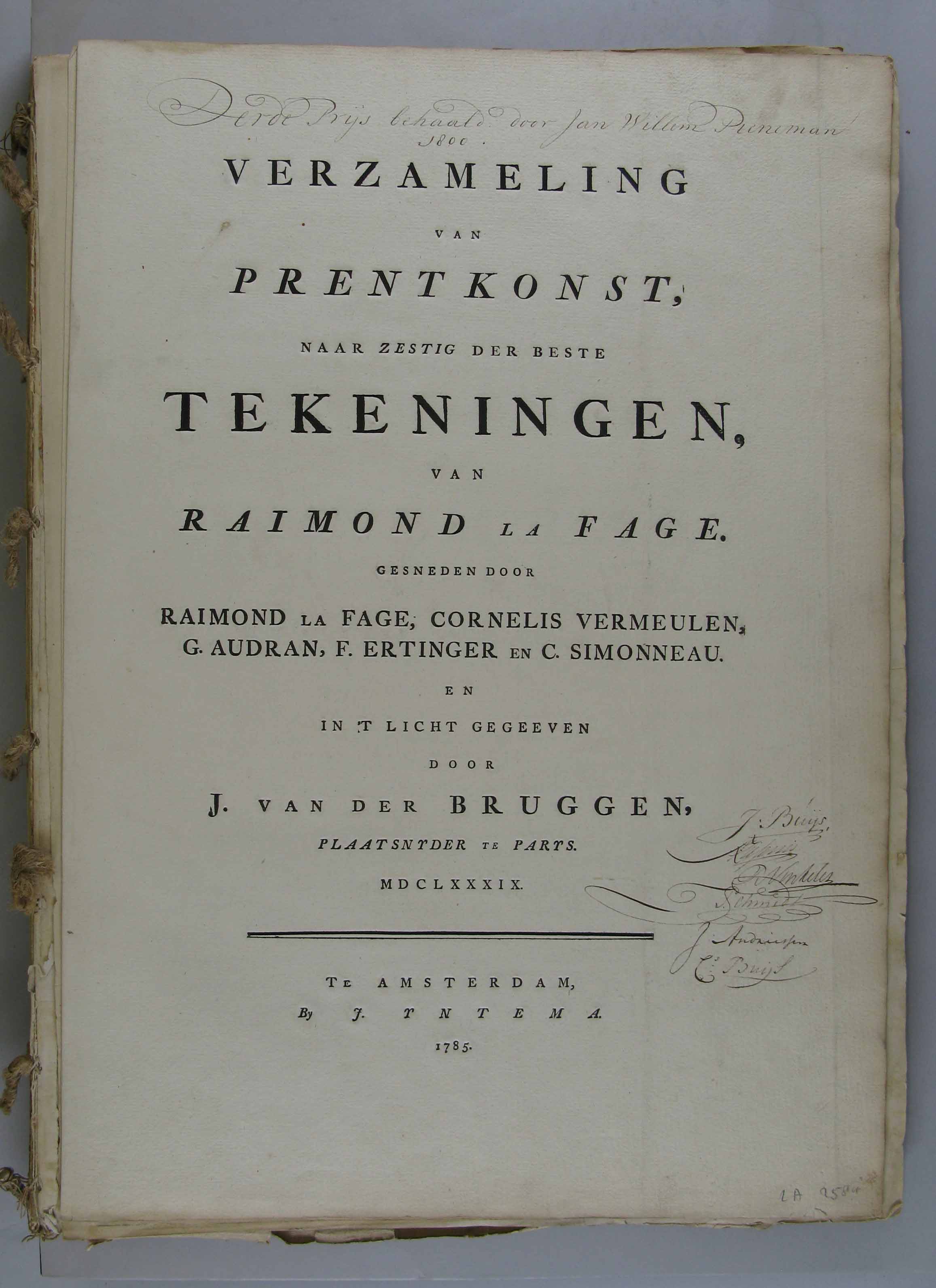 - Verzameling van prentkonst, naar zestig der beste tekeningen, van Raimond la Fage, gesneden door Raimond la Fage, Cornelis Vermeulen, G. Audran, F. Ertinger en C. Simonneau