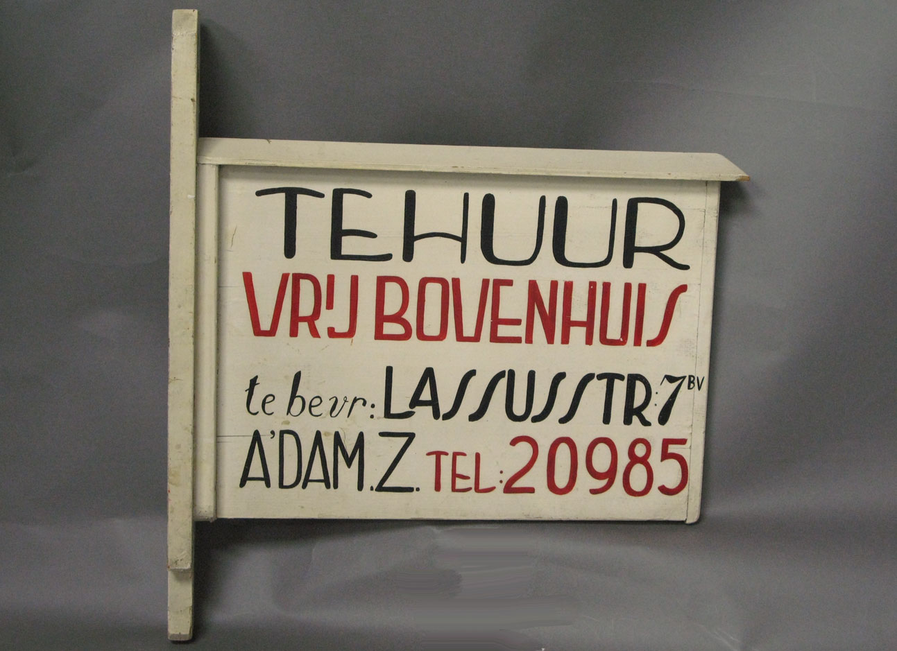- tekst voor- en achterzijde: TE HUUR/ VRIJ BOVENHUIS/ te bevr: LASSUSSTRAAT: 7 B.V./ A'DAM.Z. TEL: 20985/.