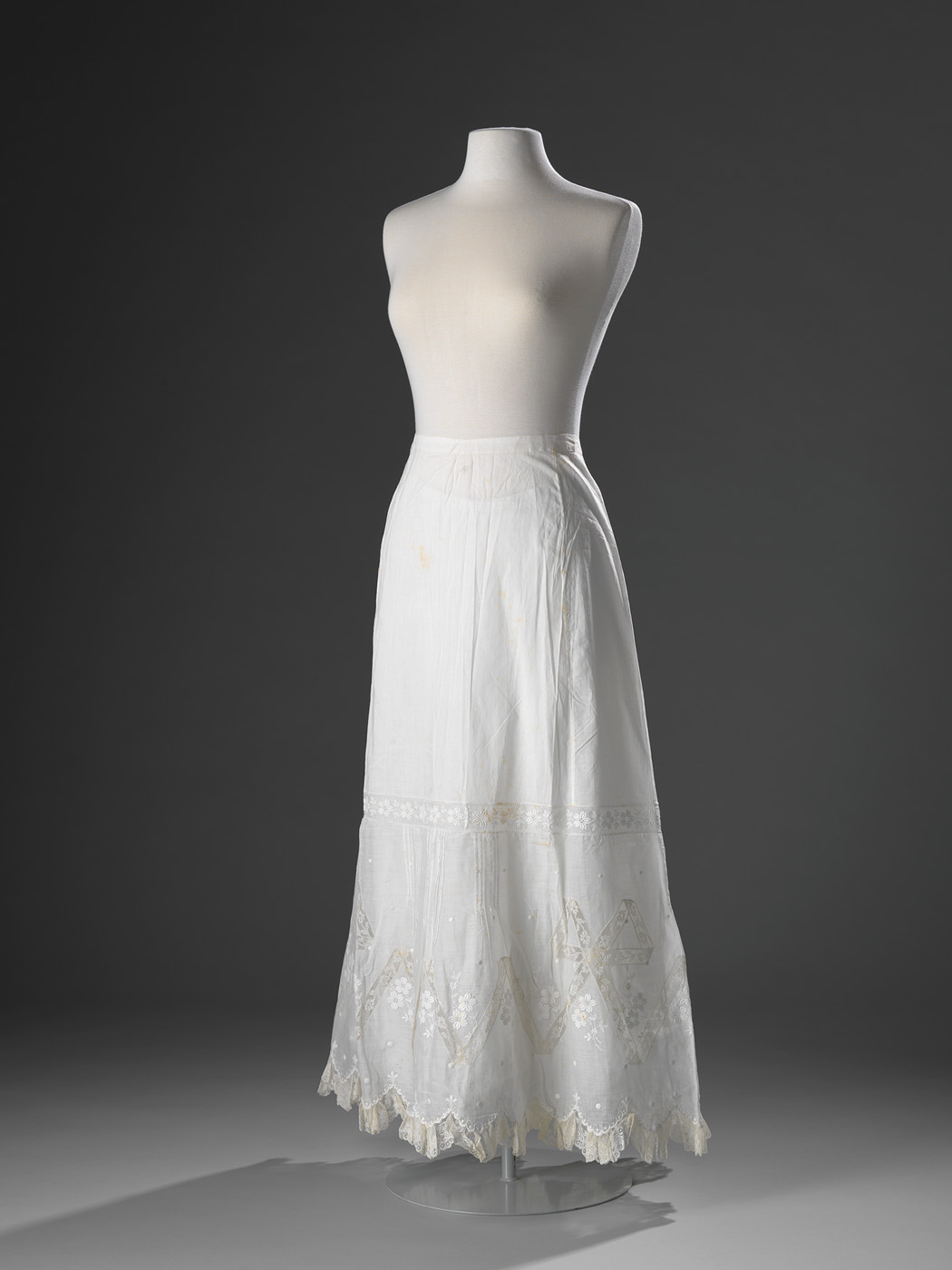 Lange onderrok van wit katoen. Van boven tot ongeveer kniehoogte enkel katoen. Onder kniehoogte versierd met kanten bandjes en borduurwerk met strik- en bloemmotief. Op kniehoogte scheiding d.m.v. borduurrand. Onder borduurrand platte, kleine plooitjes aan voor- en achterzijde. Onderkant van rok afgewerkt in schulppatroon en daaronder afgewerkt met machinaal kant. Kant lijkt met naaimachine aangezet. Middenvoor boven een klein monogram 'AS'.