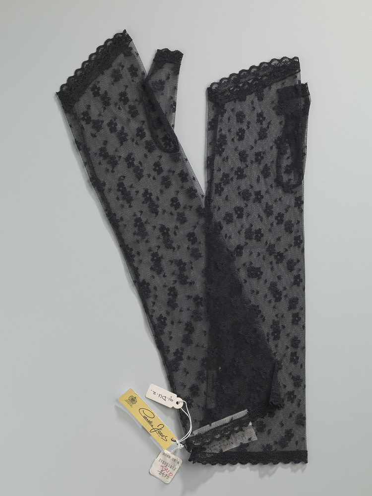 Zwarte kanten mitaine (1 van paar), van machinaal kant met strooimotief. Ongedragen, met label.- Trefwoorden