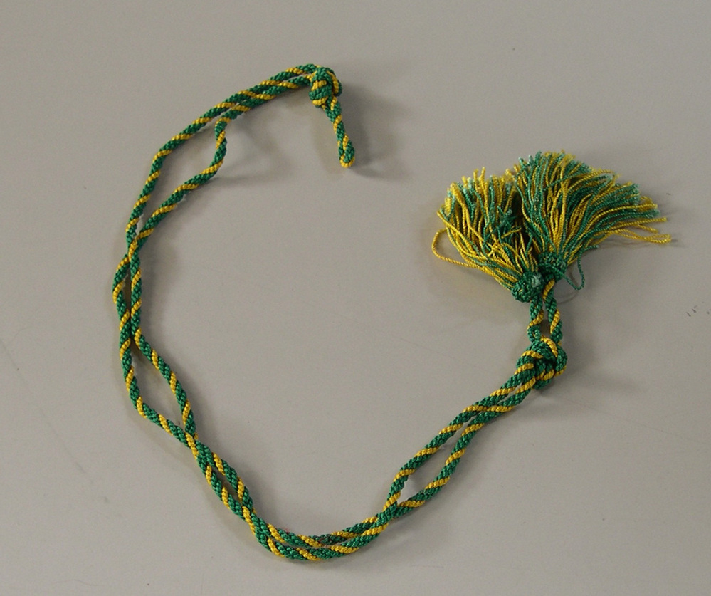 twee groene en een geel koord, die om elkaar zijn gedraaid en uitlopen in twee kwasten. aan boven en onderkant zitten een knoop zodat een lus ontstaat.- Trefwoorden