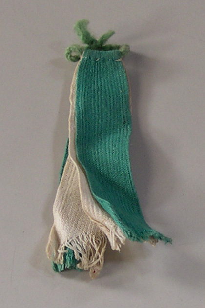 een groen en een wit dubbelgevouwen en vastgenaaide bandje, aan de bovenkant een wollen gevlochten lusje- Trefwoorden