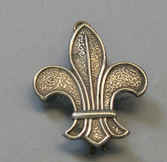 Zilverkleurige Franse lelie, aan achterzijde twee ogen en dubbelgevouwen metaaldraad waarmee de onderscheiding aan kleding kan worden bevestigd.- Trefwoorden