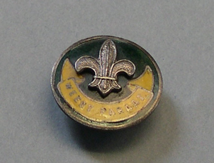 een rond in groen en geel geglazuurd knoopsgatspeldje met metalen lelie en daaronder de tekst "weest paraat", aan achterzijde opschrift "W. van Veluw ZEIST"- Trefwoorden