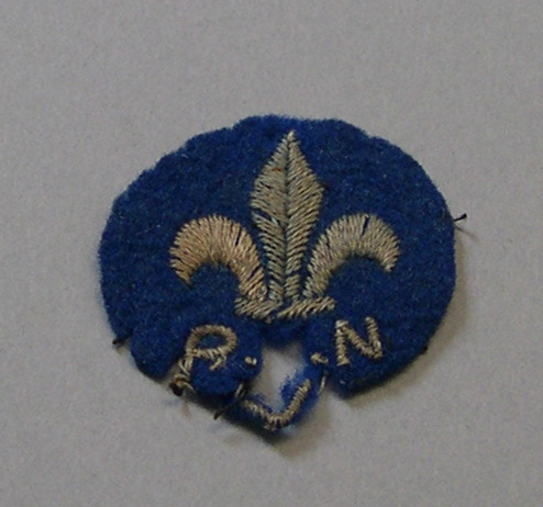 donker blauw rond vilten embleem met daarop een geborduurd lichtblauwe franse lelie en daaronder de letters "P.V.N."- Trefwoorden