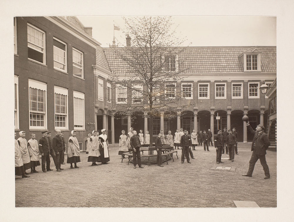 Burgerweeshuis, instructie over korfbal door meester Jan Stam op de jongensplaats