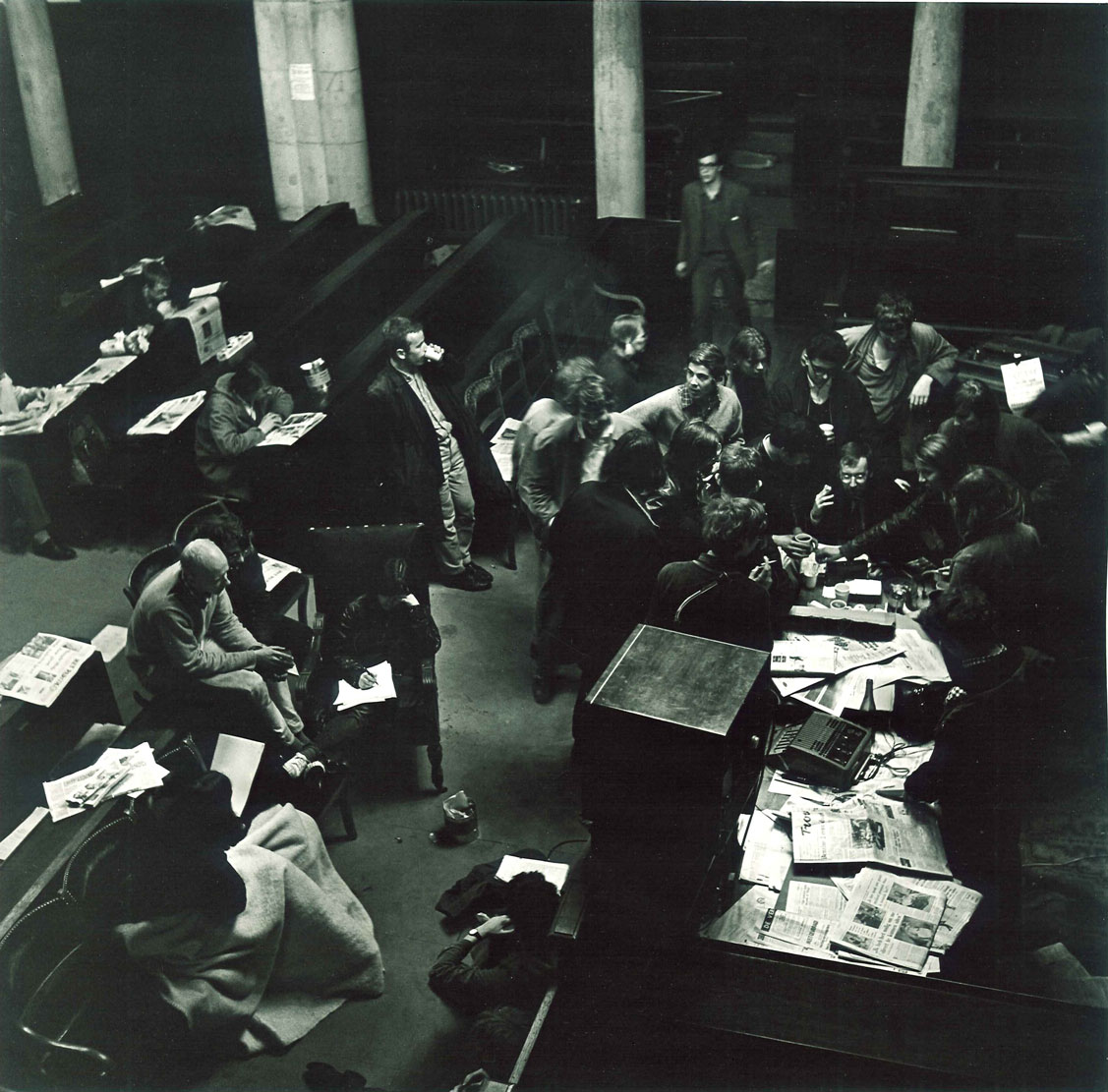 - titel/datering/signatuur achterzijde: Maagdenhuisbezetting, mei 1969/ Discussie in Aula van Lutherse Kerk/ c PAUL VAN RIEL
