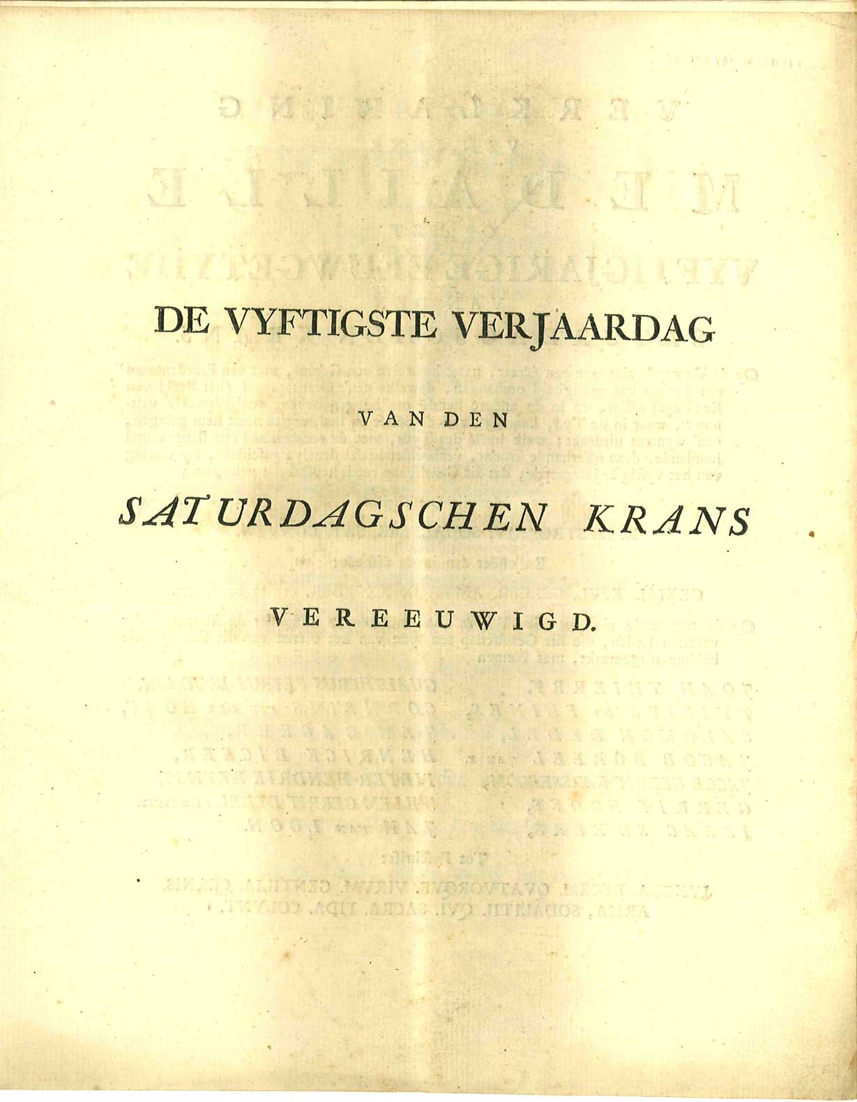 - De vyftigste verjaardag van den Saturdagschen Krans vereeuwigd. - (Colophon: Amsterdam, Petrus Schouten), 1768, 1768