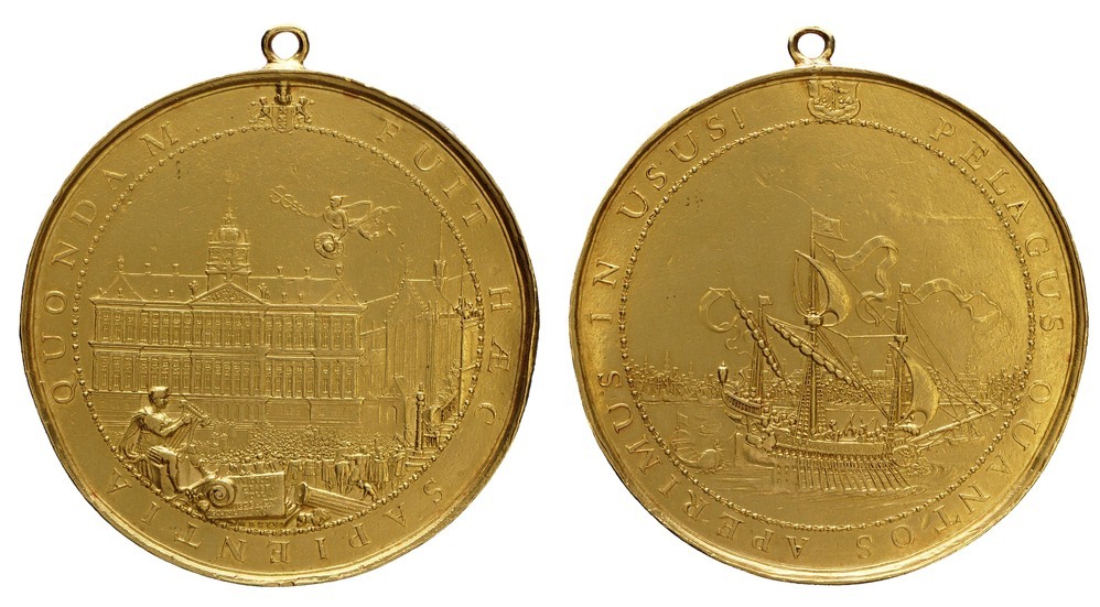 omschrift keerzijde: PELAGUS QUANTOS APERIMUS IN USUS! [tot welk groot voordeel ontsluiten wij de zee!]