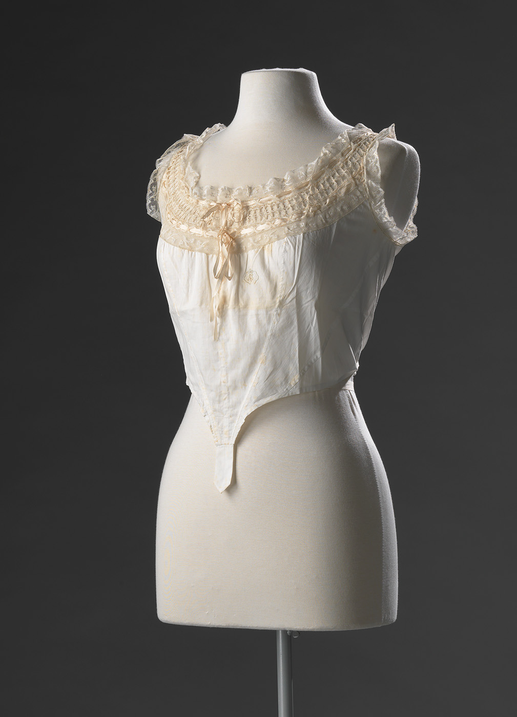 Het korsetlijfje is gemaakt van wit katoen. De mouwen en hals zijn versierd met kant en doorgetrokken linten. Het voorpand is voorzien van drie tunnels, waarin drie baleinen konden worden geplaatst. Vrouwen haalden deze eruit wanneer ze het korsetlijfje wilden gaan wassen. Om het korsetlijfje op zijn plek te houden, spelde de draagster de punt middenvoor zo laag mogelijk vast aan het korset. Een korsetlijfje werd normaliter over een korset gedragen. Vanwege de baleinen werd dit lijfje waarschijnlijk ook gedragen als onderlijfje of bustehouder. Het korsetlijfje is niet gewassen en vermoedelijk nooit gedragen. ( Judith van Amelsvoort)