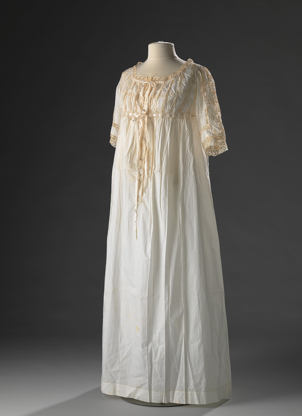 Wit nachthemd met versierd bovenlijfje. Stroken kant afgewisseld met stroken katoen. Op katoenstroken zijn versierde cirkels ingenaaid. Mouwen zijn opgebouwd uit kant en katoen. Tussen onder- en bovenkant van het nachthemd is een rand hardanjer borduurwerk geplaatst, net als bij de hals. Hier doorheen loopt een lint . Linksboven in het hemd is een monogram genaaid met letters 'AS'. Nachthemd sluit aan voorzijde met knoopjes.