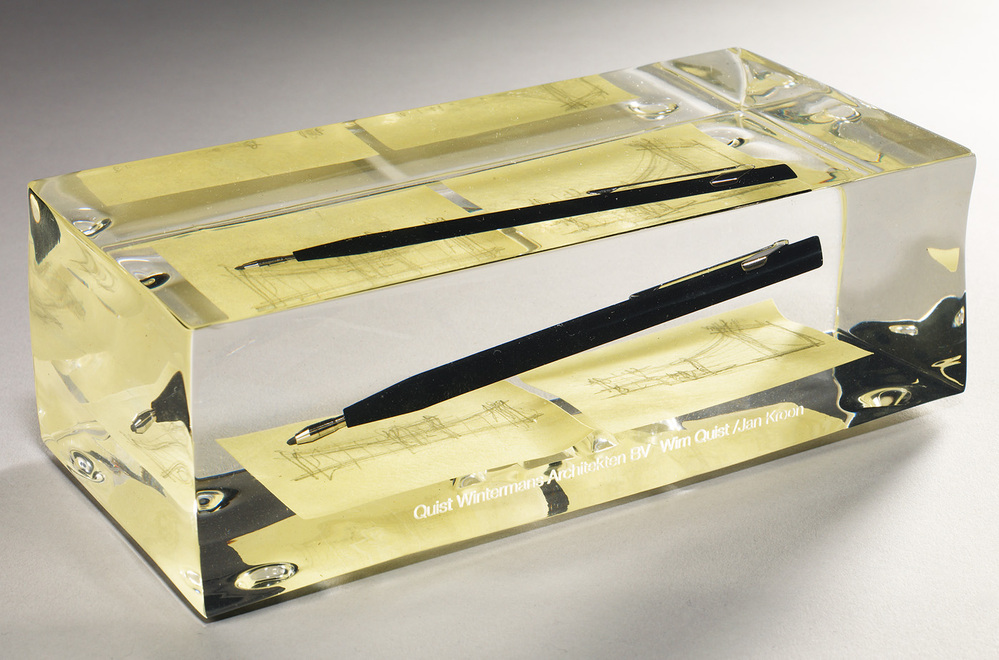 Ingegoten vulpotlood en Post-its van architect Wim Quist t.g.v. de eerstesteenlegging van het nieuwe AHM-depotgebouw op 14 oktober 2009 in Amsterdam-Noord