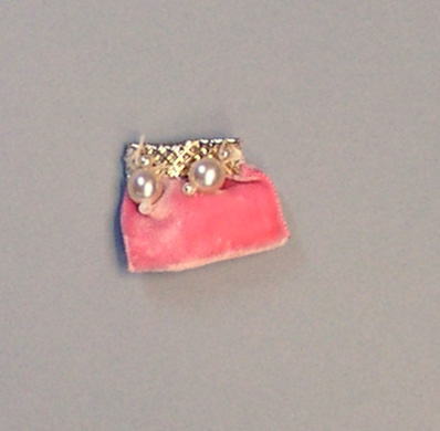 Roze fluwelen tasje met aan bovenzijde een goudkleurige rand. Aan de rand zijn kraaltjes bevestigd.- Trefwoorden