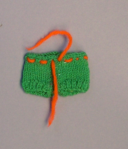 Kort broekje gebreid van groene wol, met oranje riem.- Trefwoorden