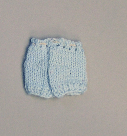 Kort broekje gebreid van lichtblauwe wol, met elastiek in bovenkant.- Trefwoorden