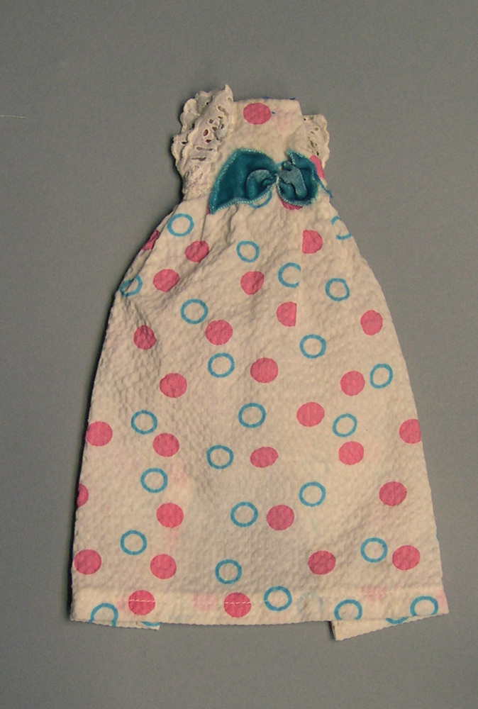 Witkatoenen jurk met roze stippen en blauwe cirkels. Op de overgang van het lijfje naar de rok is een fluwelen strik bevestigd en aan de mouwtjes broderie.- Trefwoorden