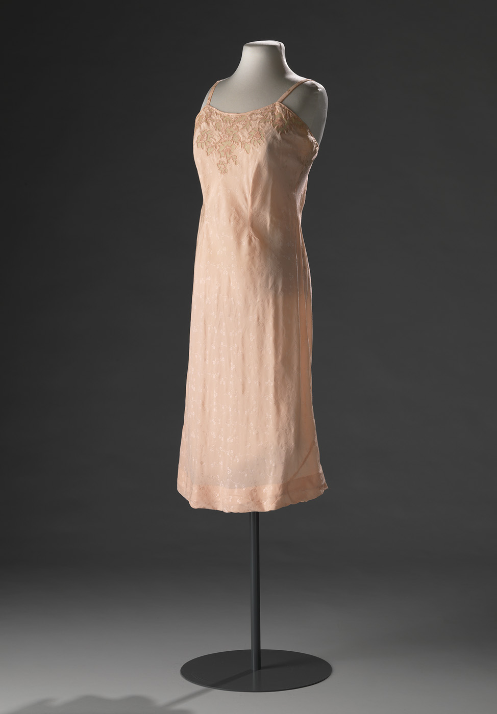Tijdens het interbellum bleef de vorm van de nachtjapon in essentie hetzelfde. De pyjama was echter nog steeds een nieuwigheid en kende vele vormen. Waar in de jaren twintig het jongensachtige figuur in de mode was, kreeg in de jaren dertig het vrouwelijke silhouet weer de voorkeur. De verleidelijke avondjaponnen werden geïmiteerd in de nachtjaponnen: met een lage halsuitsnijding, semi-transparante materialen en splitten. Maar ook de slanke lijn en uitwaaierende rokken zien we in de nachtkleding terug. De ietwat mannelijke pyjamabroeken, werden aan de onderzijde verwijd zodat als men stond het net een lange rok leek. Deze kenmerken zien we ook terug in de tweedelige pyjama van Gerzon. De top heeft aan de voor- en achterzijde een lage V-hals en op tailleniveau twee striklinten die op de rug gestrikt worden. De broek heeft een glad heupstuk, waaraan de lange pijpen met platte plooien zijn aangezet. De pijpen zijn onderaan verwijd door middel van driehoekige inzetjes, die versierd zijn met bloemmotieven (uitsparingen) op crèmekleurig tule. In deze periode had het ondergoed allerlei kleuren, maar wit werd opvallend weinig gebruikt. Materialen varieerden van kunstzijde en satijn, crêpe de Chine, shantung, met garneringen van crèmekleurige kant of Valenciennes kant. Zowel de onderjurk, onderbroek als de tweedelige pyjama zijn gemaakt van lichtroze kunstzijde met een ingeweven bloem- en bladmotief. Allen zijn versierd, weliswaar op verschillende plaatsen, met het identieke bloemmotief (uitsparing) op crèmekleurig tule. Ook de bijbehorende verpakking is bewaard gebleven; Een rechthoekige kledingdoos van bruin karton met op de deksel een opdruk in zwart: een wereldbol met daaronder 'G.G.' / 'Gerzon's MODEMAGAZIJNEN'. ( Judith van Amelsvoort)