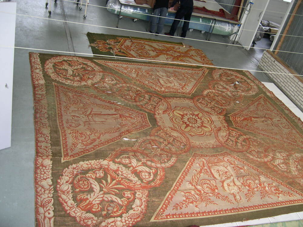 Het kleed bestaat uit stroken van 70 cm. die aan de achterkant met overhandse steken aan elkaar zijn genaaid. In het midden veld een geometrisch bloemmotief in beige, oranje en geel. Op de korte kant aan weerszijden een vrouwfiguur. Aan de lange kant aan weerszijden een allegorisch mansfiguur.