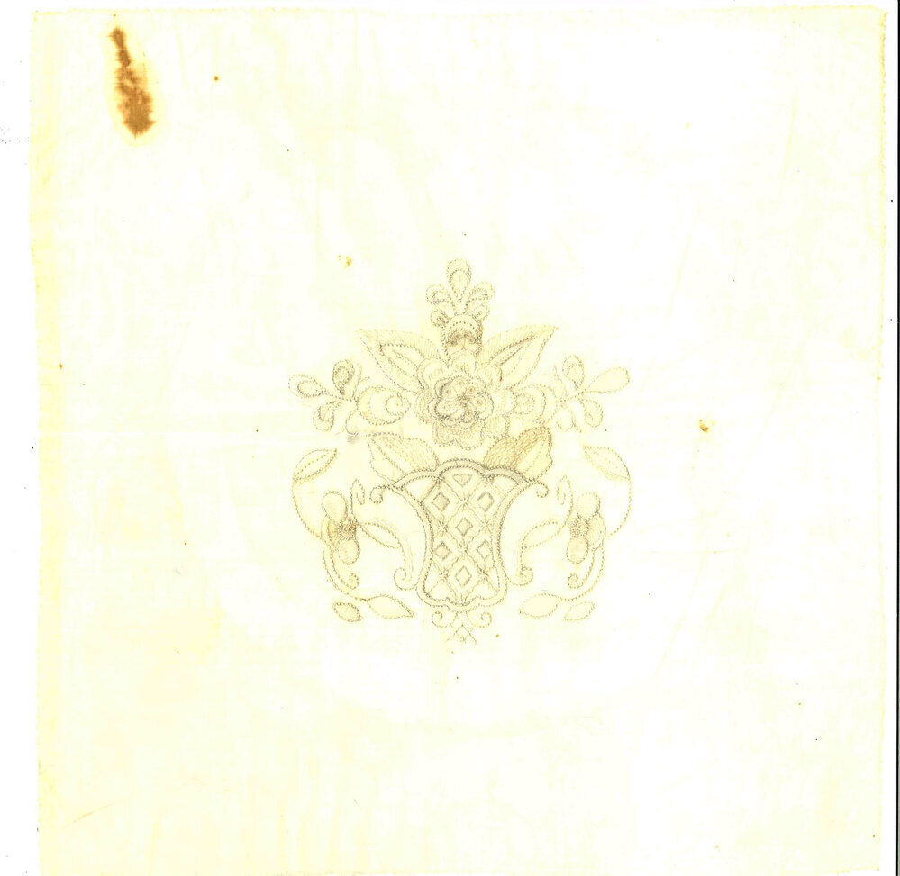 Wit doorschijnend tule met blad- en bloemmotieven in wit garen. Bruine vlek in linker bovenhoek.