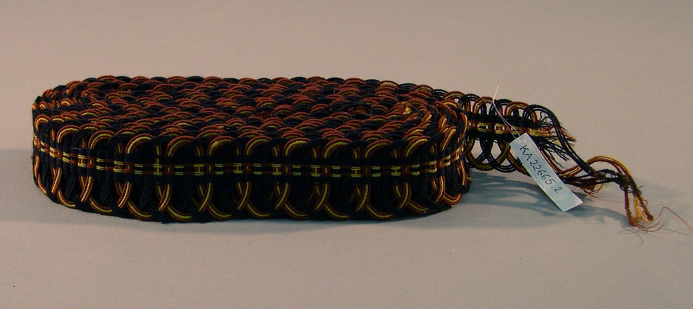 Rol gevlochten passement in bruine, blauwe en gele wol (nieuw nagemakt naar origineel KA 22665.2).- Trefwoorden